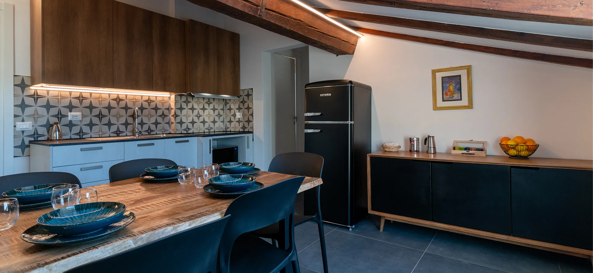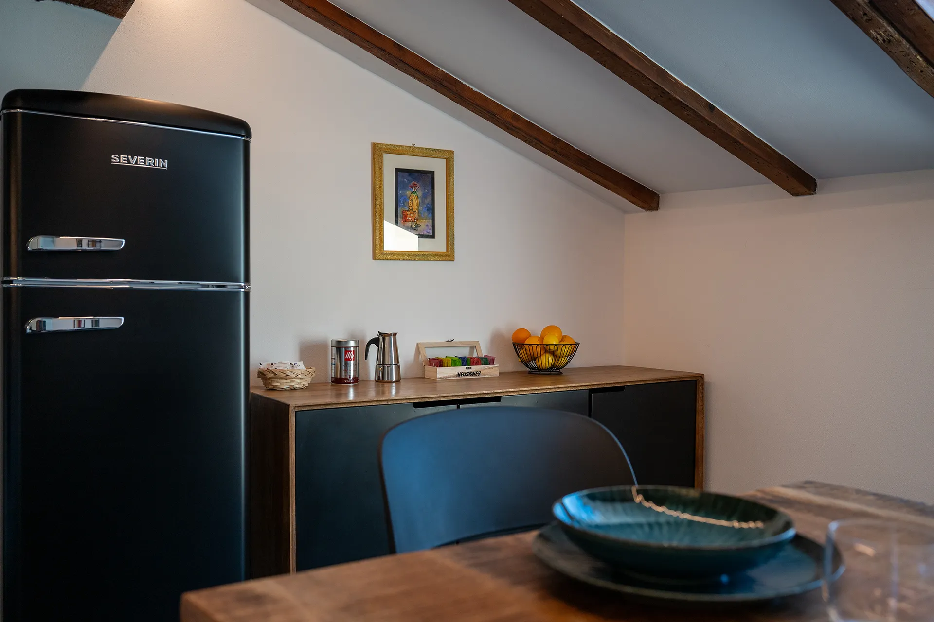 Ambiente moderno e funzionale con tutto il necessario: zona pranzo luminosa con piano cottura, frigo, macchina del caffè e un set tavola essenziale per un pasto veloce.